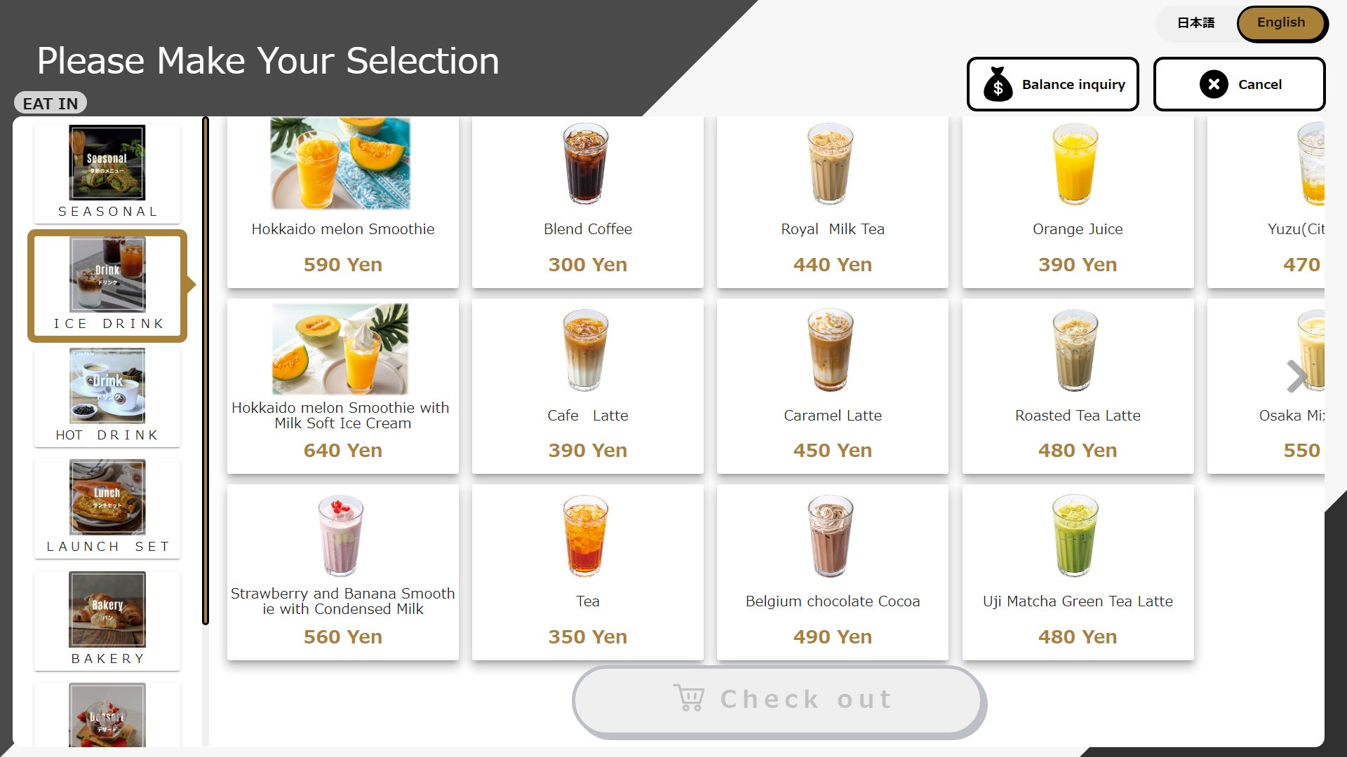 出張等で来日した外国人ビジネスマンや訪日旅行客が多いスフィアタワー天王洲店では、多言語機能でメニューや操作画面の英語表記に対応。画面の言語切替ボタンでお客さまご自身が簡単に切替可能。