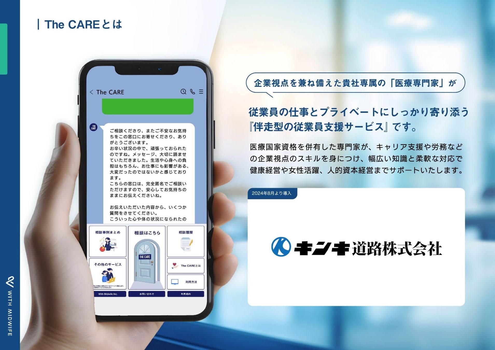 株式会社With Midwife(本社:大阪市、以下With Midwife)が提供する健康と子育ての従業員支援プログラム「The CARE」を、橋梁補修を専門に工事業を行うキンキ道路株式会社(本社:大阪市、以下キンキ道路)が、2024年8月1日より導入開始しました。従業員だけではなくその家族も相談が可能であり、仕事や家庭の問題を同じ専門家に相談できる体制を整え、総合的なサポートでパフォーマンス向上を目指します。