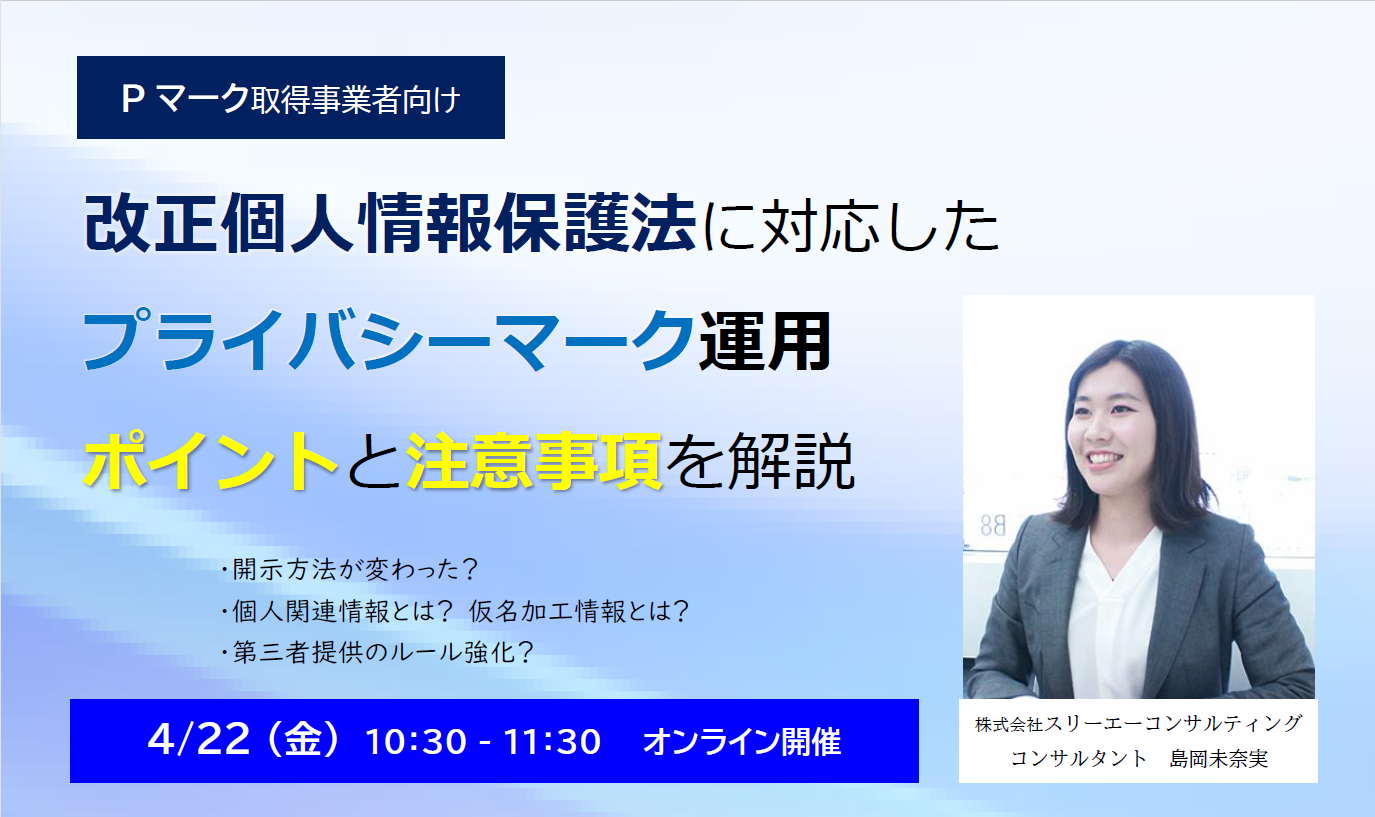 【Pマーク取得事業者向けウェビナー】改正個人情報保護法に対応したプライバシーマーク運用のポイントと注意事項を解説!4/22(金)10:30~無料