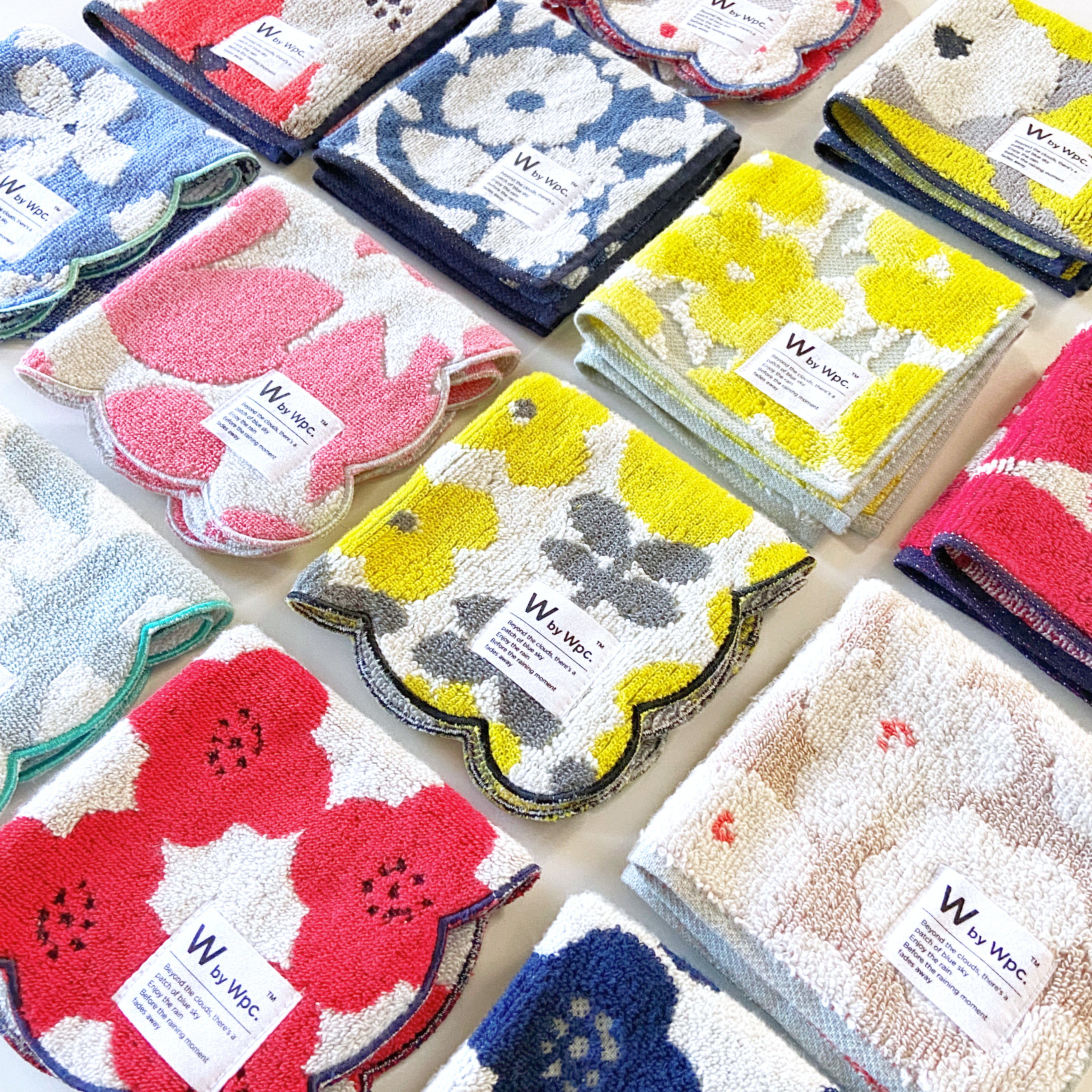 Wpc.の人気テキスタイルを使ったハンカチは今年新たに3柄が加わり、バリエーションも豊かになりました。無撚糸を使用しているためふわふわで手触りが良い部分もポイント。スタンダードタイプ、スカラップタイプ、パターンパイピングタイプの全19柄展開です。この他、ユニセックスデザインもご用意しております。