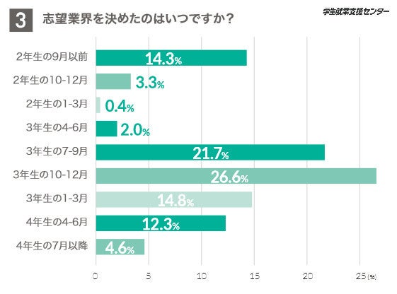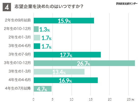 志望企業の決定時期は「3年生の10-12月」(26.7%)と回答した学生が最も多く、「3年生の7-9月」(17.7%)、「4年生の4-6月」(16.9%)がそれに続きました。
