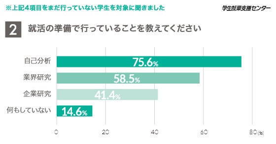 自己分析を実施している学生が75.6%と最も多く、業界研究58.5%、企業研究41.4%と続きました。