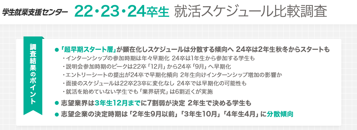 - 学生の就活スケジュールは年々早期化の傾向 24卒のスタート時期は2年生秋冬から