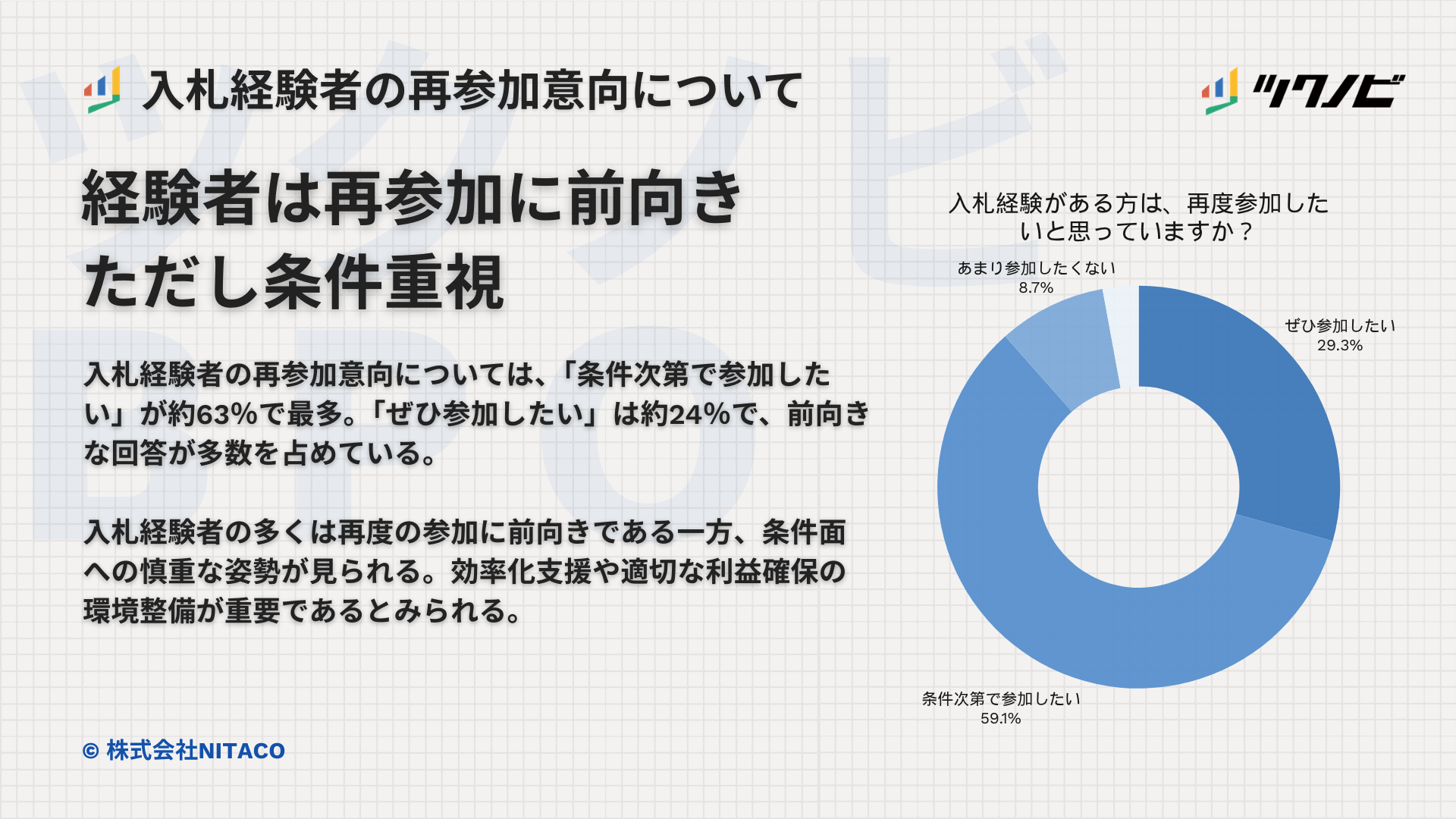 入札経験者の多くは再度の参加に前向きである一方、条件面への慎重な姿勢が見られます。業務負担や収益性への懸念が背景にあると考えられ、効率化支援や適切な利益確保の環境整備が重要になるといえます。