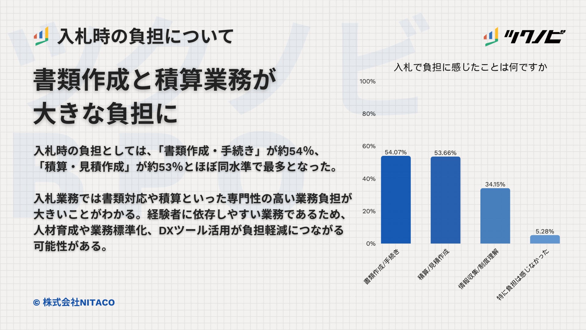 入札業務では書類対応や積算といった専門性の高い業務負担が大きいことが明らかになりました。経験者に依存しやすい業務であるため、人材育成や業務標準化、DXツール活用が負担軽減につながる可能性があります。