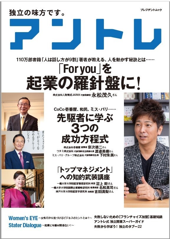 本誌では、110万部を売り上げた書籍『人は話し方が9割』(すばる舎)の著者である株式会社人財育成JAPAN 代表取締役 永松茂久氏や、カレーハウスCoCo壱番屋 創業者 宗次德二氏、ワタミ株式会社 代表取締役会長兼社長 渡邉(正しくはしんにょうに点がひとつ)美樹氏、ミス・パリ・グループ株式会社 代表取締役会長 下村朱美氏といった著名な経営者のインタビューを紹介しているほか、当社の知見に加え、約40社に及ぶフランチャイズ(FC)や代理店の独立加盟情報を比較検討しやすく整理して公開しています。また特集ページにリンクしたWebサイトを準備し、独立への具体的な行動はネット上で進める仕組みにすることで、紙とWebのシナジーをいかし幅広い世代の独立・開業を後押ししていきます。