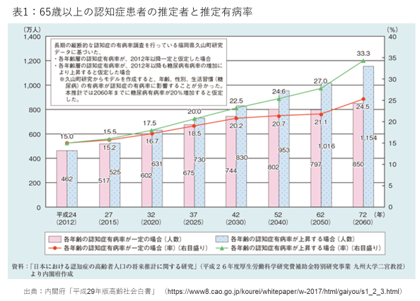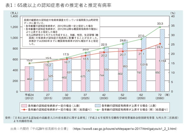 内閣府の「平成29年版高齢社会白書」※表¹によると、2025年には5人に1人が認知症患者になると見込まれており、誰もが認知症になる可能性がある時代になってきています。