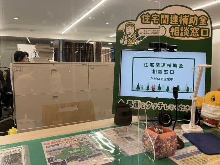 呼び出しボタンを押したお客さまに、住宅関連補助金の相談窓口スタッフが、自宅にいながらリモートで補助金の問い合わせの対応をおこなっています。