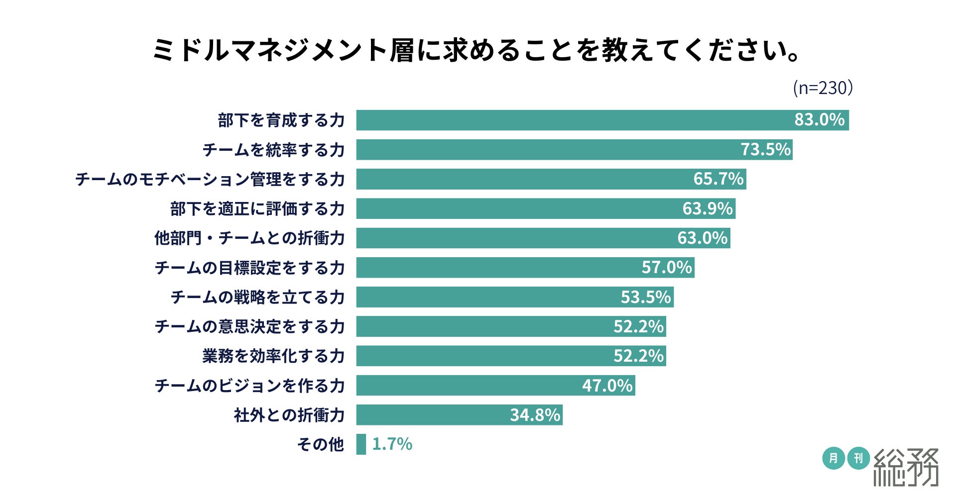 ミドルマネジメント層に求めるのは「部下を育成する力」「チームを統率する力」など