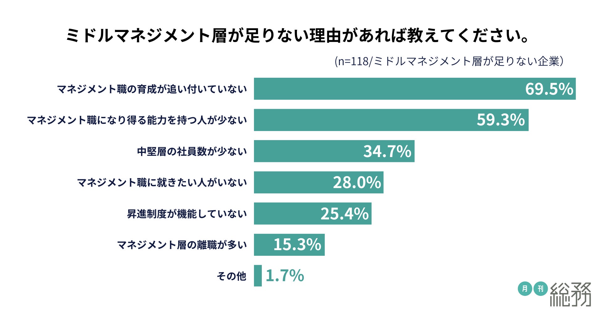 ミドルマネジメント層が足りない理由は、「マネジメント職の育成が追い付いていない」が約7割で最多となりました(n=118/ミドルマネジメント層が足りない企業)。