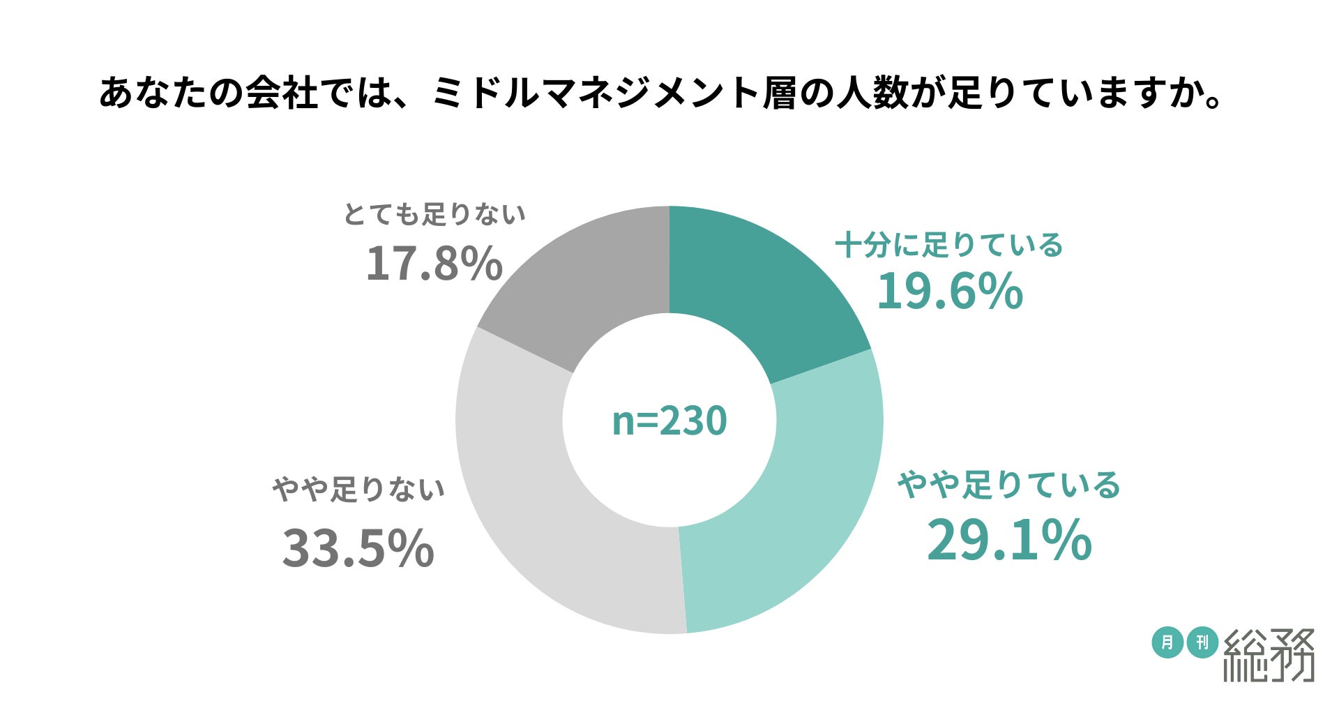 ミドルマネジメント層の人数が足りているか尋ねたところ、約半数が足りていないと回答しました(n=230)。