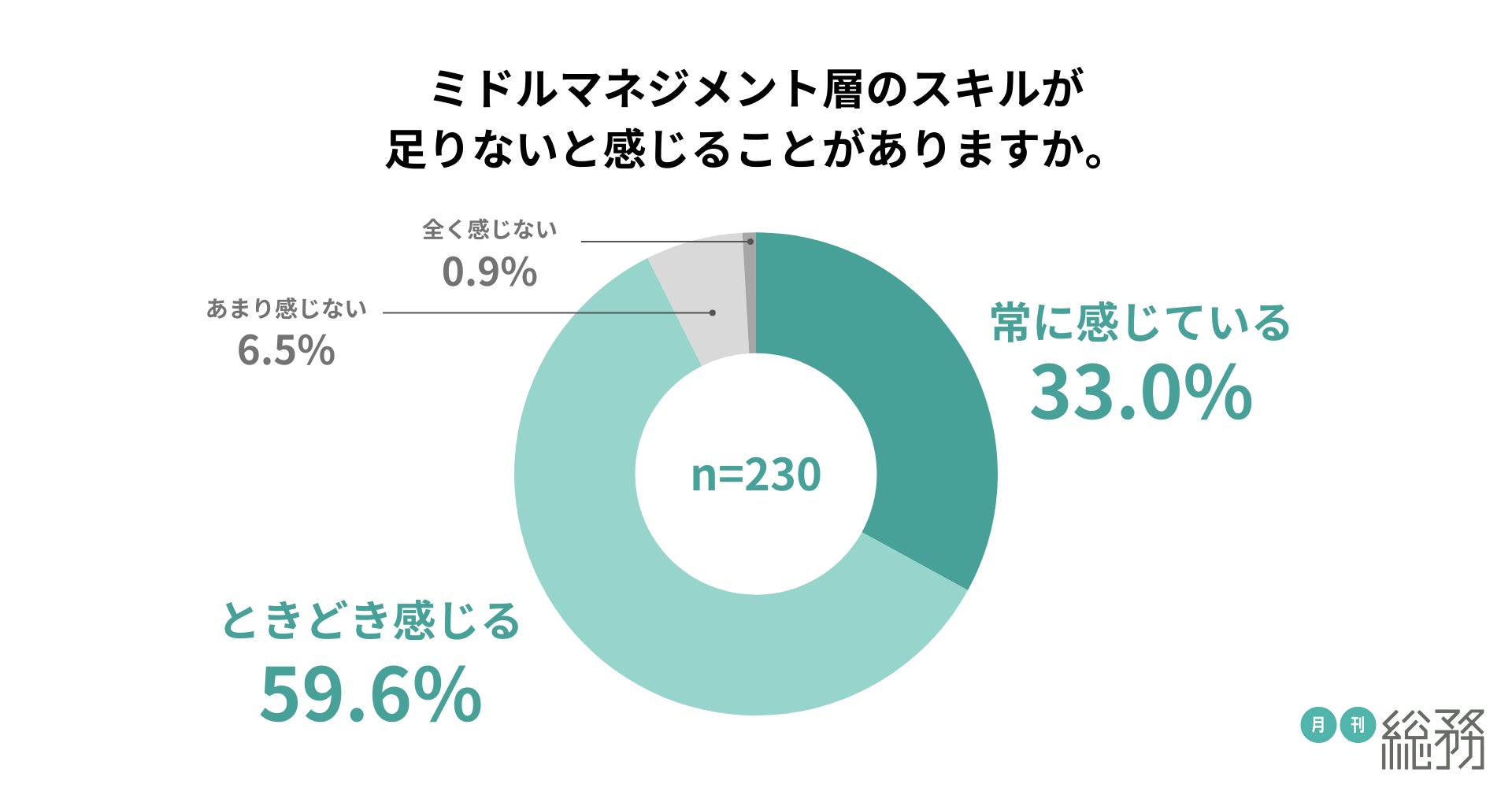 日本で唯一の総務専門誌『月刊総務』を発行する株式会社月刊総務(所在地:東京都千代田区、代表取締役:豊田健一)は、全国の総務担当者を対象に「ミドルマネジメントについての調査」を実施し、230名から回答を得ました。