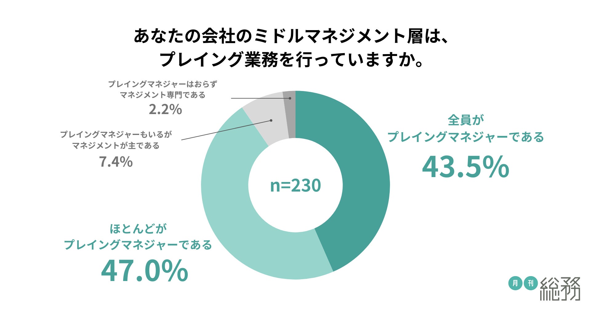 ミドルマネジメント層がプレイング業務を行っているか尋ねたところ、約9割がプレイングマネジャーであることがわかりました(n=230)。