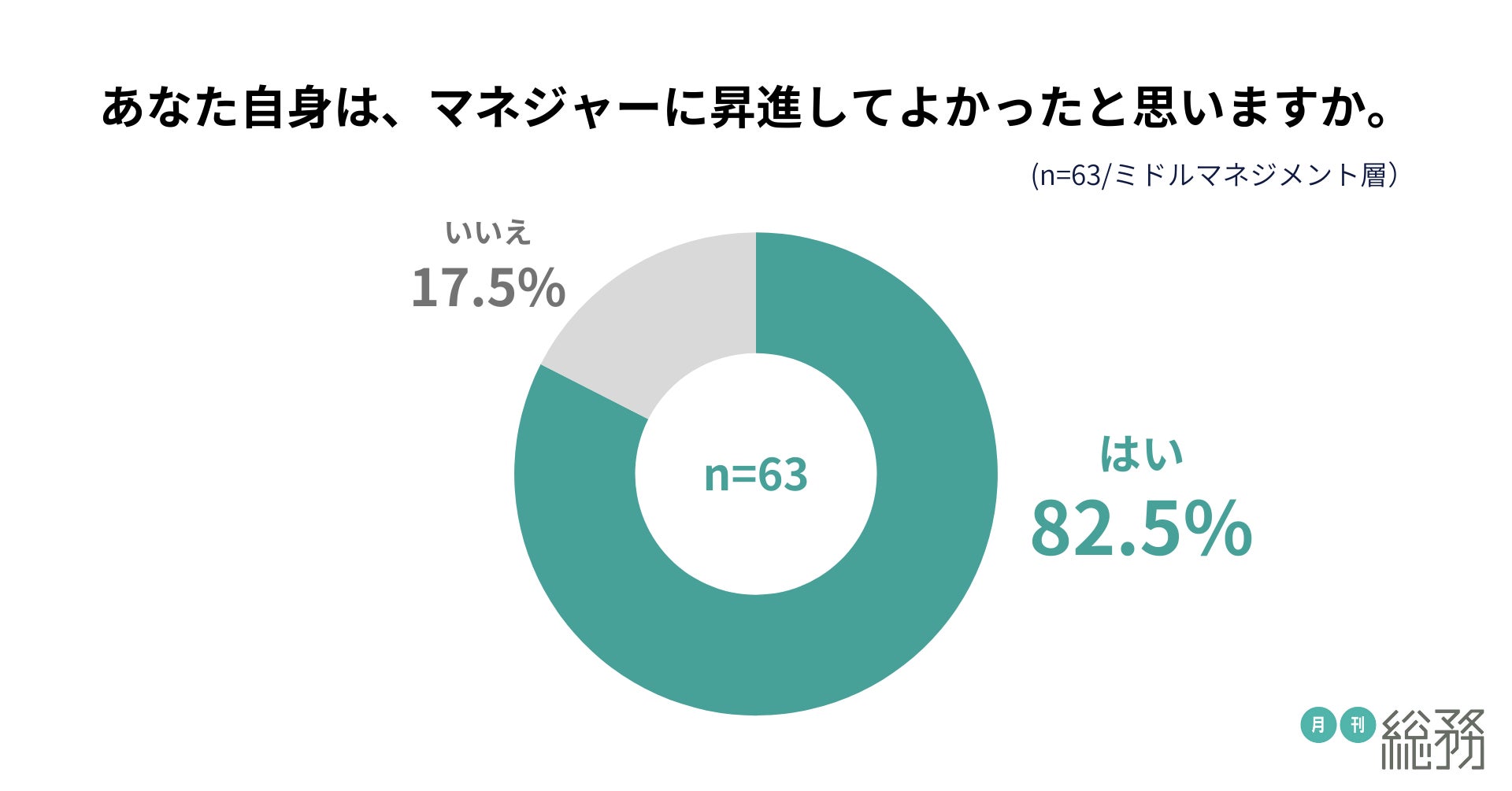 マネジャー層に対し、マネジャーに昇進してよかったと思うか尋ねたところ、8割以上がよかったと回答しました(n=63/ミドルマネジメント層)。