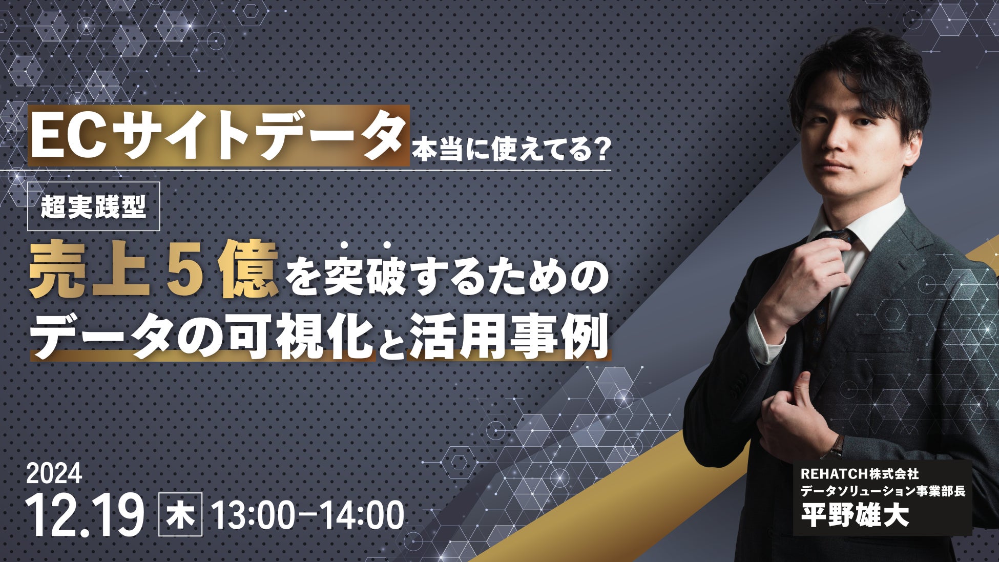 本セミナーでは、弊社の広告BIツールONEの開発者であり、データソリューション事業責任者の平野から、EC事業で売上5億円を突破するためのデータの可視化や活用の方法について、成功事例を用いて解説します。