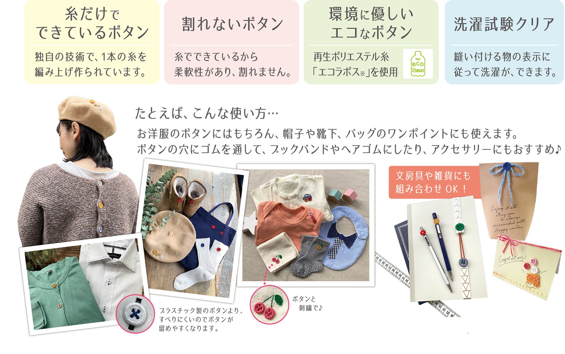 お洋服のボタンにはもちろん、帽子や靴下、バッグ等のワンポイントにも使え、またボタンの穴にゴムを通して、ブックバンドやヘアゴムにしたり、アクセサリーにも。また文房具や雑貨との組み合わせもおすすめです。
