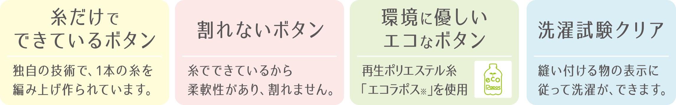 独自の技術で1本の糸だけで編み上げられた【糸ボタン】は、再生ポリエステル糸を使用し、環境に優しいエコなボタンです。