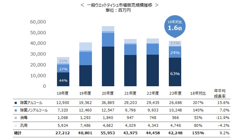 23年度のウエットティシュ全体の市場規模はコロナ前の18年度に比べて1.6倍に拡大しています(※)。感染状況の落ち着きから23年度は若干の減少が見られたものの、急激な減少とはならず、ウエットティシュの使用が生活習慣として根づいたと考えられます。