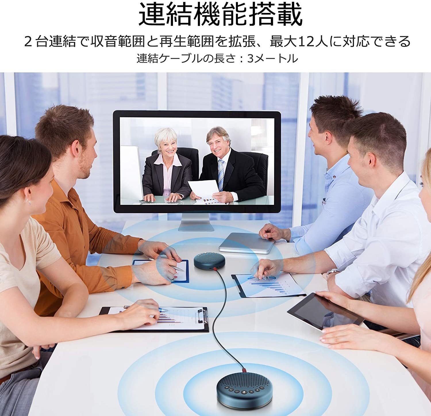 1台で5~8人の参加する会議に対応できるほか、オプション(別売り)の連結ケーブルを使ってもう1台のLuna Liteスピーカーフォンと連結することで、収音範囲および再生範囲を拡張することが可能です。