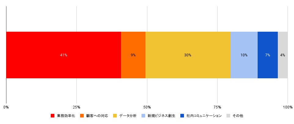 業務効率化が41%で最も高く、次いでデータ分析が30%、顧客への対応や新規ビジネス創生に期待が寄せられています。さらに、社内コミュニケーションやその他の項目でもAI活用に対する期待が示されました。