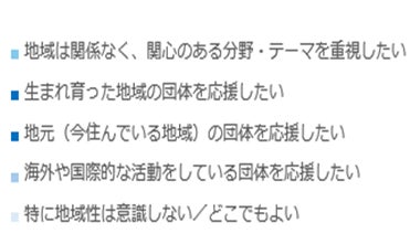 20代から70代すべてを対象にした際、都市圏11.7%に対し地方圏は18.4%(6.7pt多い)が「地元の団体を応援したい」と回答しており、地元支持は都市より地方で強まり、生活圏とのつながりが寄付判断に影響していることが分かりました。