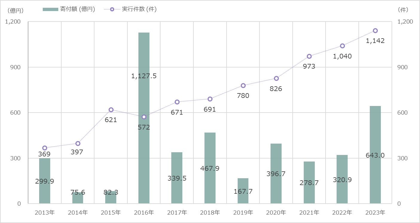 2023年度は、全国で1,142件が実行され約643億円が遺贈寄付されており、昨年度に比べると、金額は倍増し、件数は約10%の伸びを見せている。
