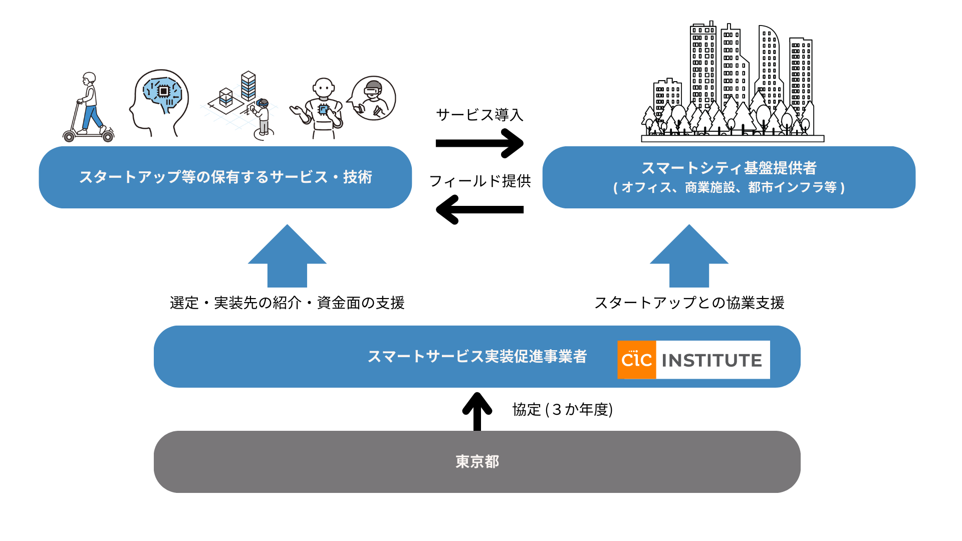 CIC Instituteは、「スマート東京」の実現に向け、最先端の技術やサービスを保有する「スタートアップ等」と 実装先となるオフィスや商業施設を保有する「スマートシティ基盤提供者」が協業可能な体制を構築し、技術やサービスの実装を促進します。