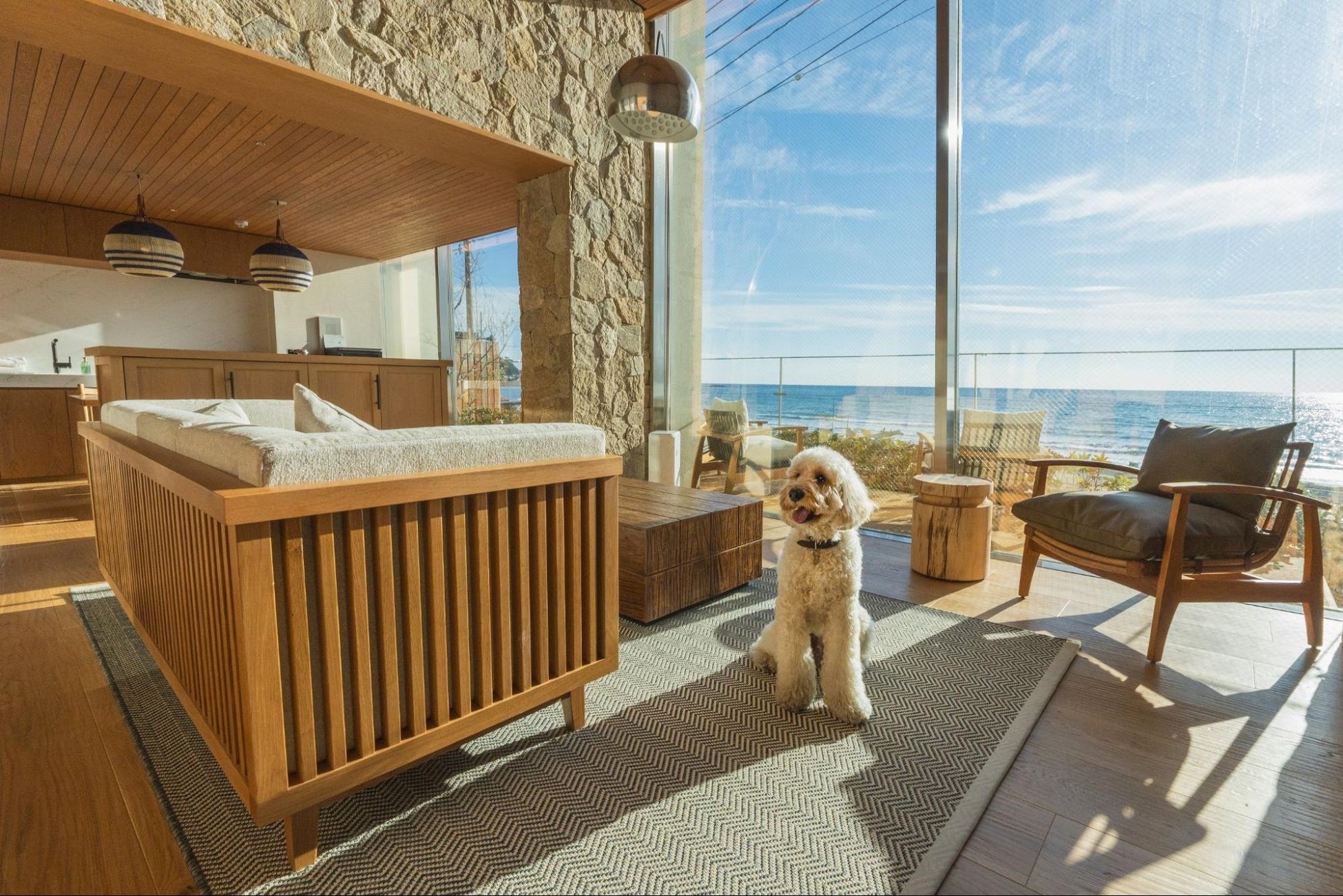 リビングルームは大きな窓から材木座海岸を一望できる贅沢な空間。広々としたスペースで海を感じながらペットとともに特別な時間をお過ごしいただけます。