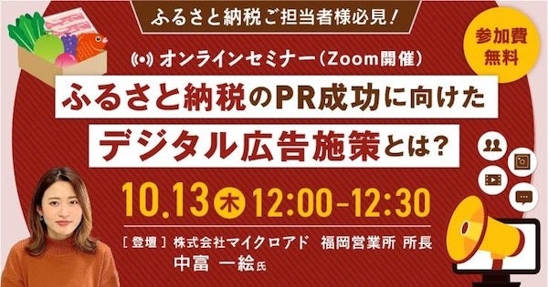 株式会社マイクロアド(本社:東京都渋谷区、代表取締役社長:渡辺健太郎、以下 マイクロアド)は、自治体のデジタル広告担当者様・広告代理店様に対し、ふるさと納税のPR成功に向けたデジタル広告施策を解説するオンラインセミナーを開催いたします。