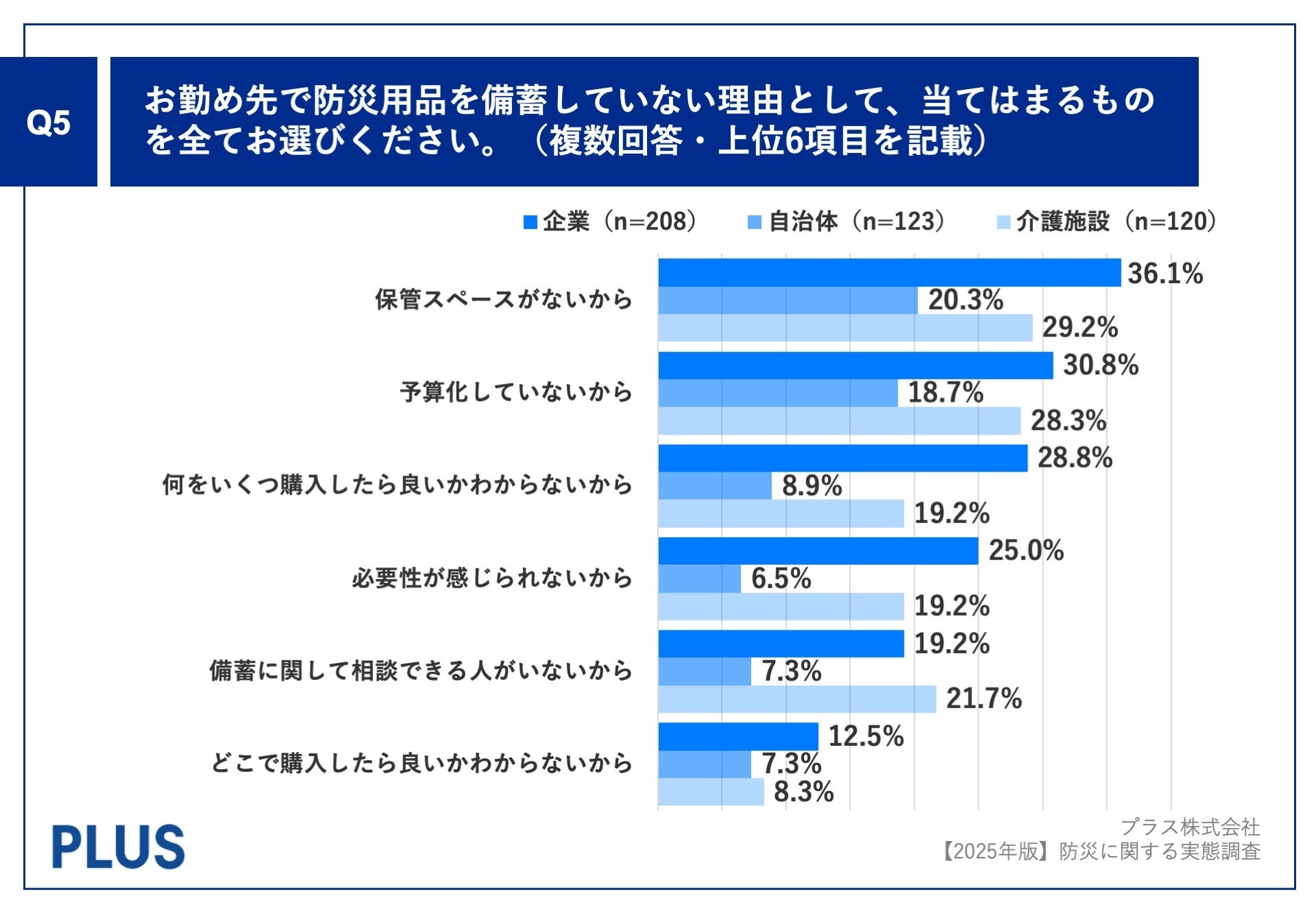 Q3で「防災用品の備蓄」と回答していない方に、「Q5.お勤め先で防災用品を備蓄していない理由として、当てはまるものを全てお選びください。(複数回答)」と質問したところ、「保管スペースがないから」との回答が、企業(n=208)36.1%、自治体(n=123)20.3%、介護施設(n=120)29.2%と最多となり、次いで「予算化していないから」との回答が、企業(n=208)30.8%、自治体(n=123)18.7%、介護施設(n=120)28.3%となりました。