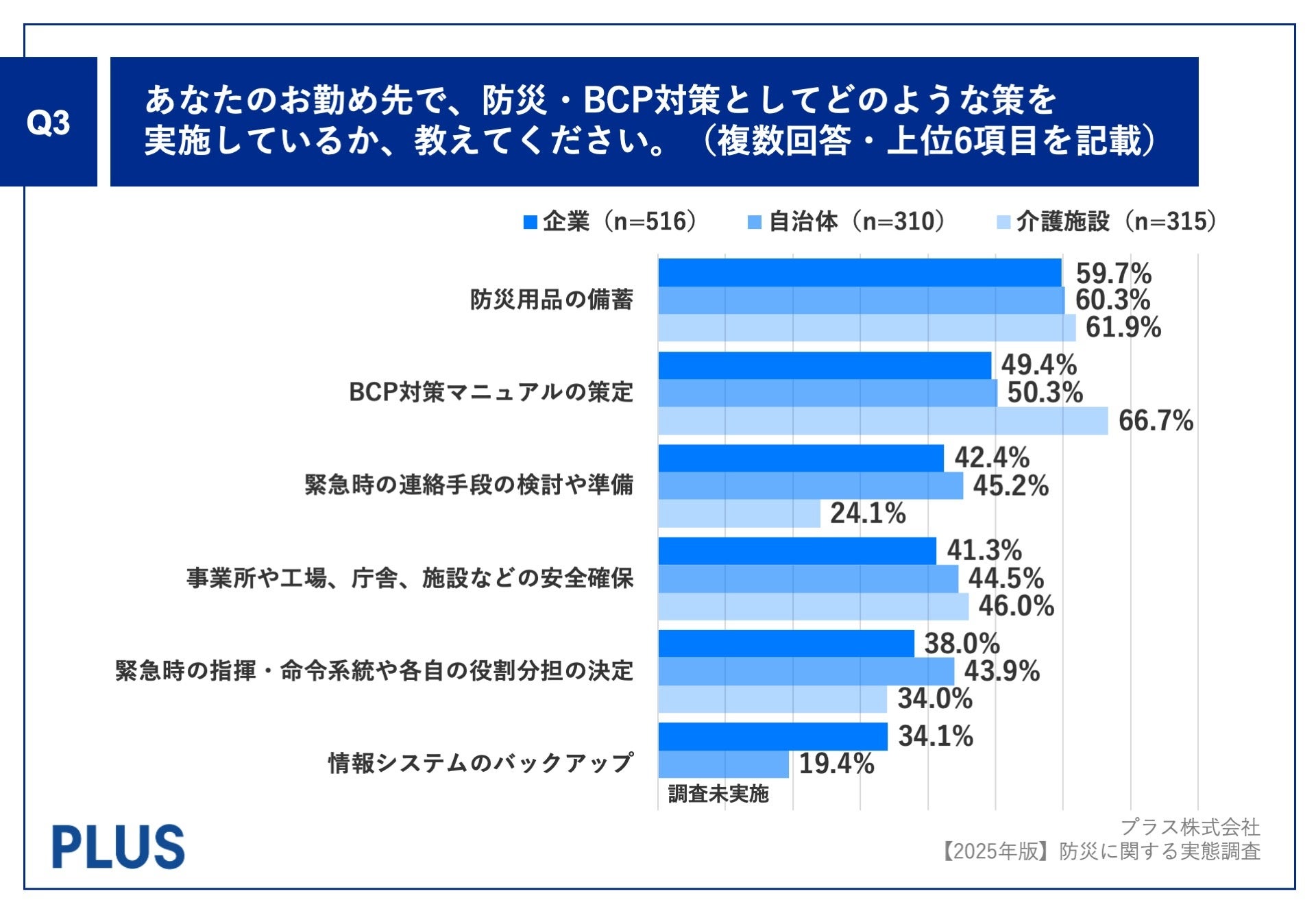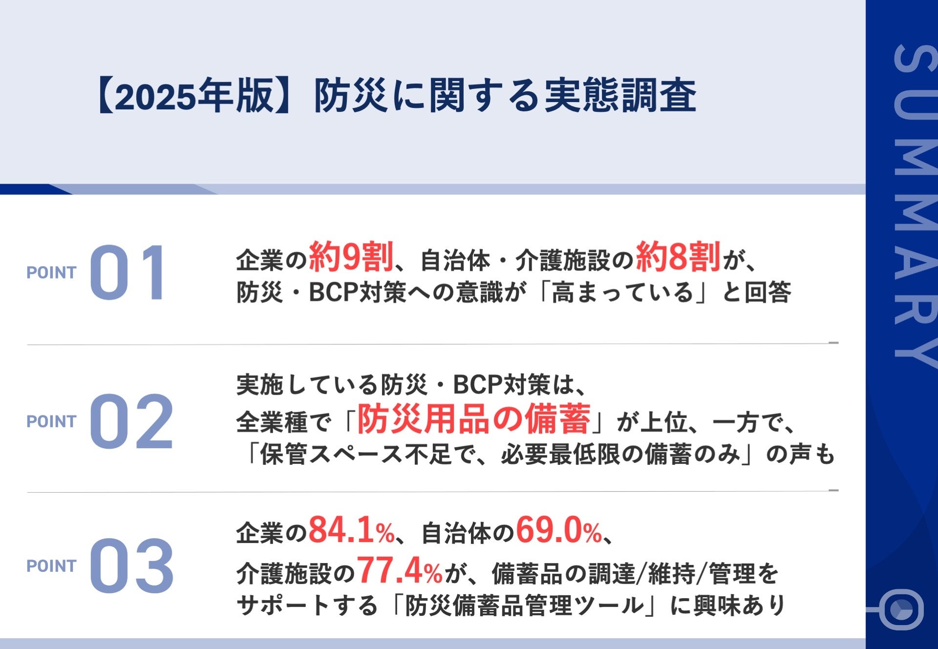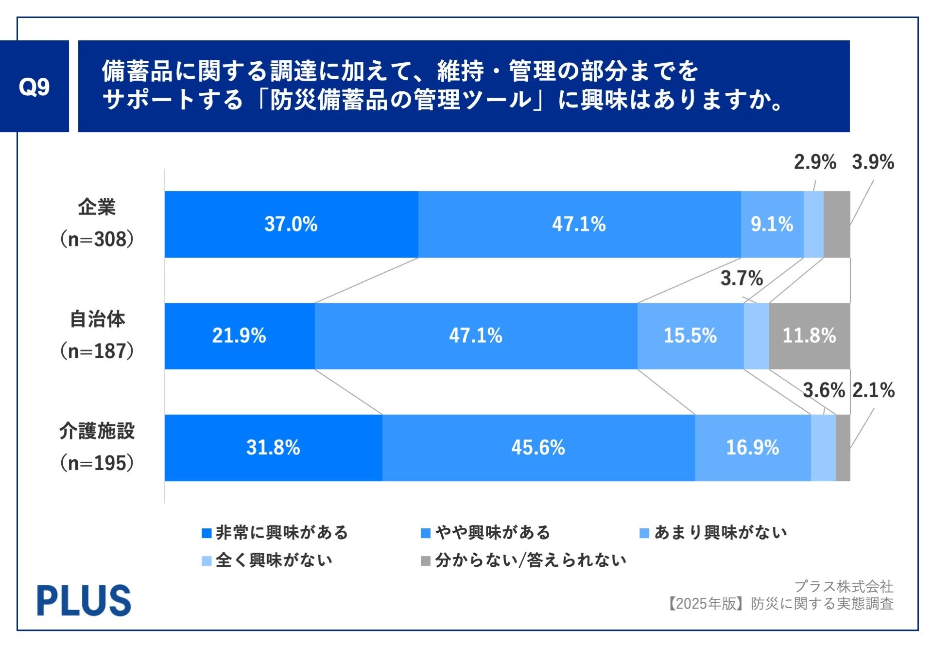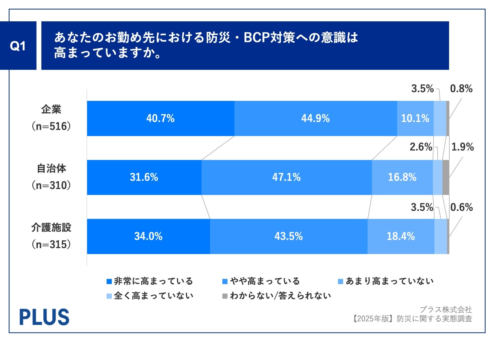 防災・BCP対策用品の販売、商品の選定・管理・買替に関するソリューションを提供し、対策検討~導入~導入後のフォローまでワンストップのサポートを提供する(https://kikitai.biz/jtx/)防災備蓄品の在庫・期限管理などの管理業務ツール「サクッとkeep」(https://www.smartkaigo.jp/contents/lp/keep/)を提供するプラス株式会社(本社:東京都港区、代表取締役社長:今泉忠久)は、従業員数10名以上の企業で防災・BCP対策に関わっている経営者・総務担当者516名、防災課(危機管理課)に所属している自治体職員310名、介護施設の経営者・施設長・ホーム長・管理者315名を対象に、【2025年版】防災に関する実態調査を実施しましたので、お知らせいたします。
