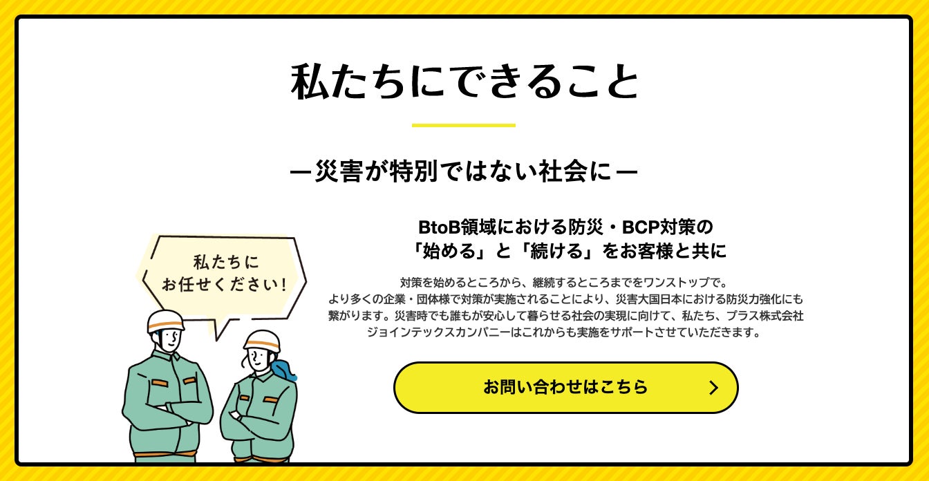 より多くの企業・団体様で対策が実施されることにより、災害大国日本における防災力強化にも繋がります。災害時でも誰もが安心して暮らせる社会の実現に向けて、私たち、プラス株式会社ジョインテックスカンパニーはこれからもサポートさせていただきます。