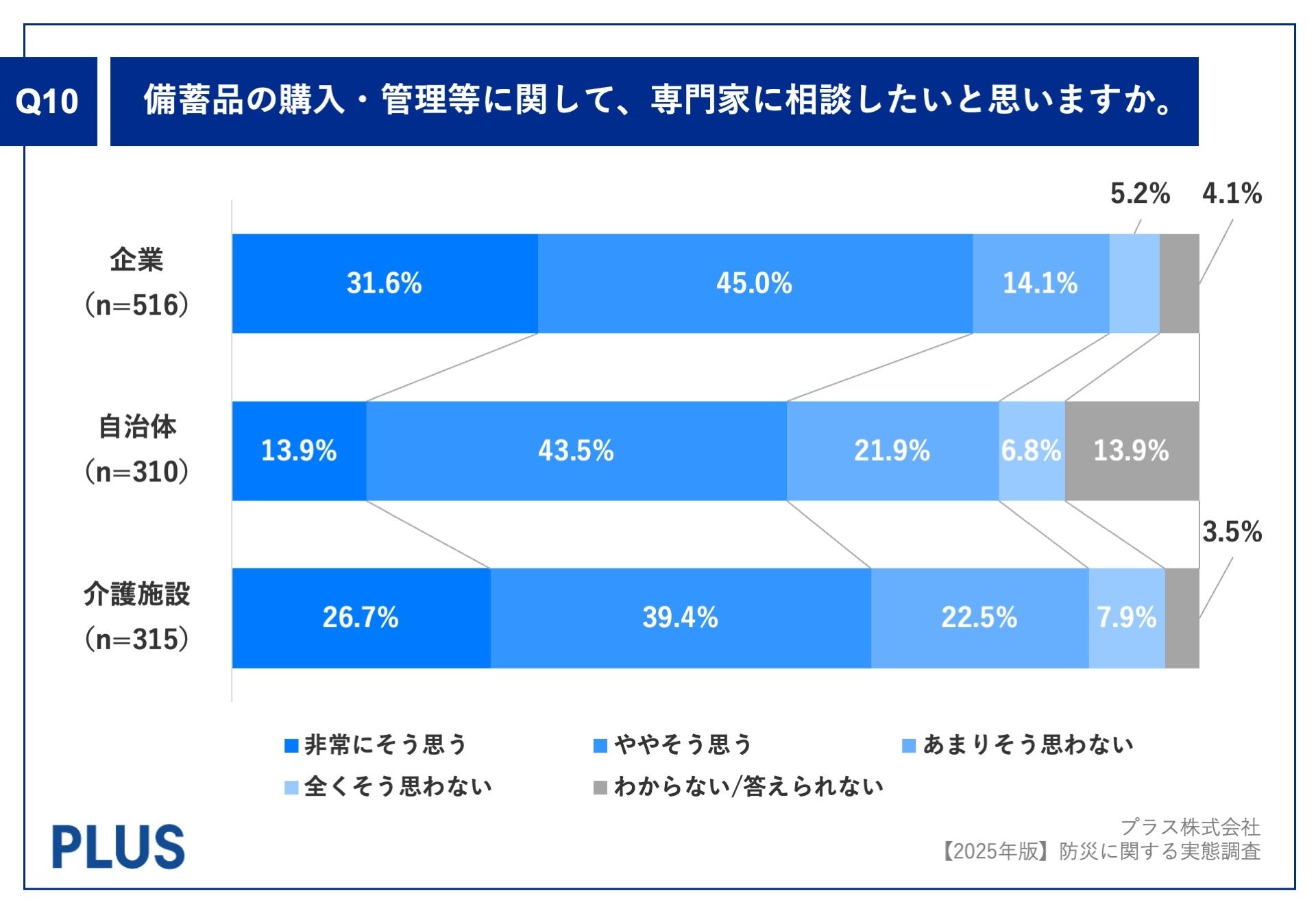 「Q10.備蓄品の購入・管理等に関して、専門家に相談したいと思いますか。」と質問したところ、「そう思う」という回答が、企業(n=516)76.6%、自治体(n=310)57.4%、介護施設(n=315)66.1%となりました。