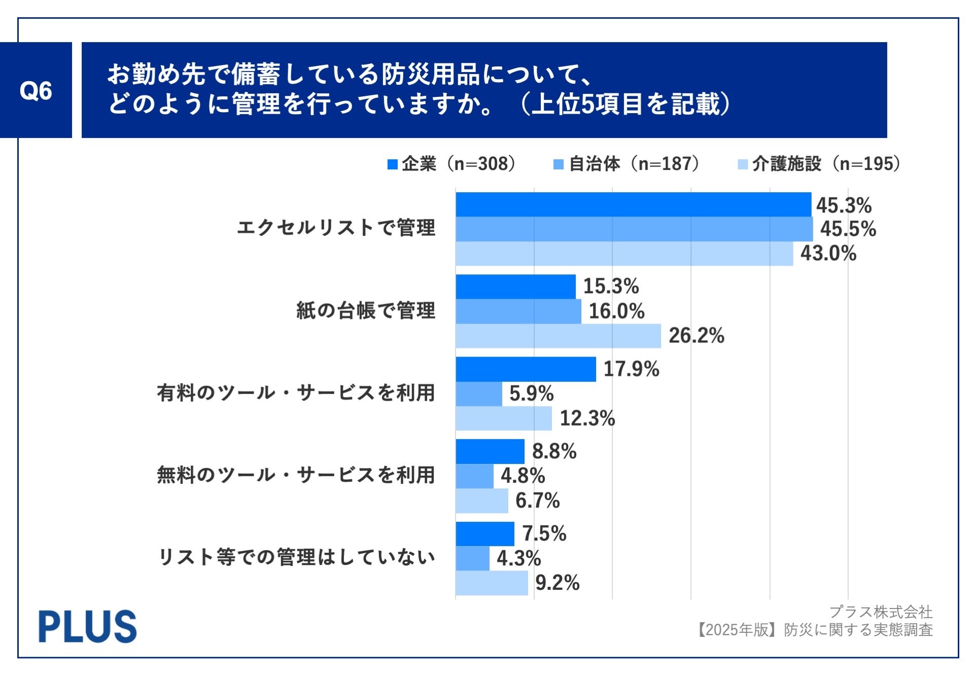 Q3で「防災用品の備蓄」と回答した方に、「Q6.お勤め先で備蓄している防災用品について、どのように管理を行っていますか。」と質問したところ、「エクセルリストで管理」との回答が、企業(n=308)45.3%、自治体(n=187)45.5%、介護施設(n=195)43.0%と最多となりました。