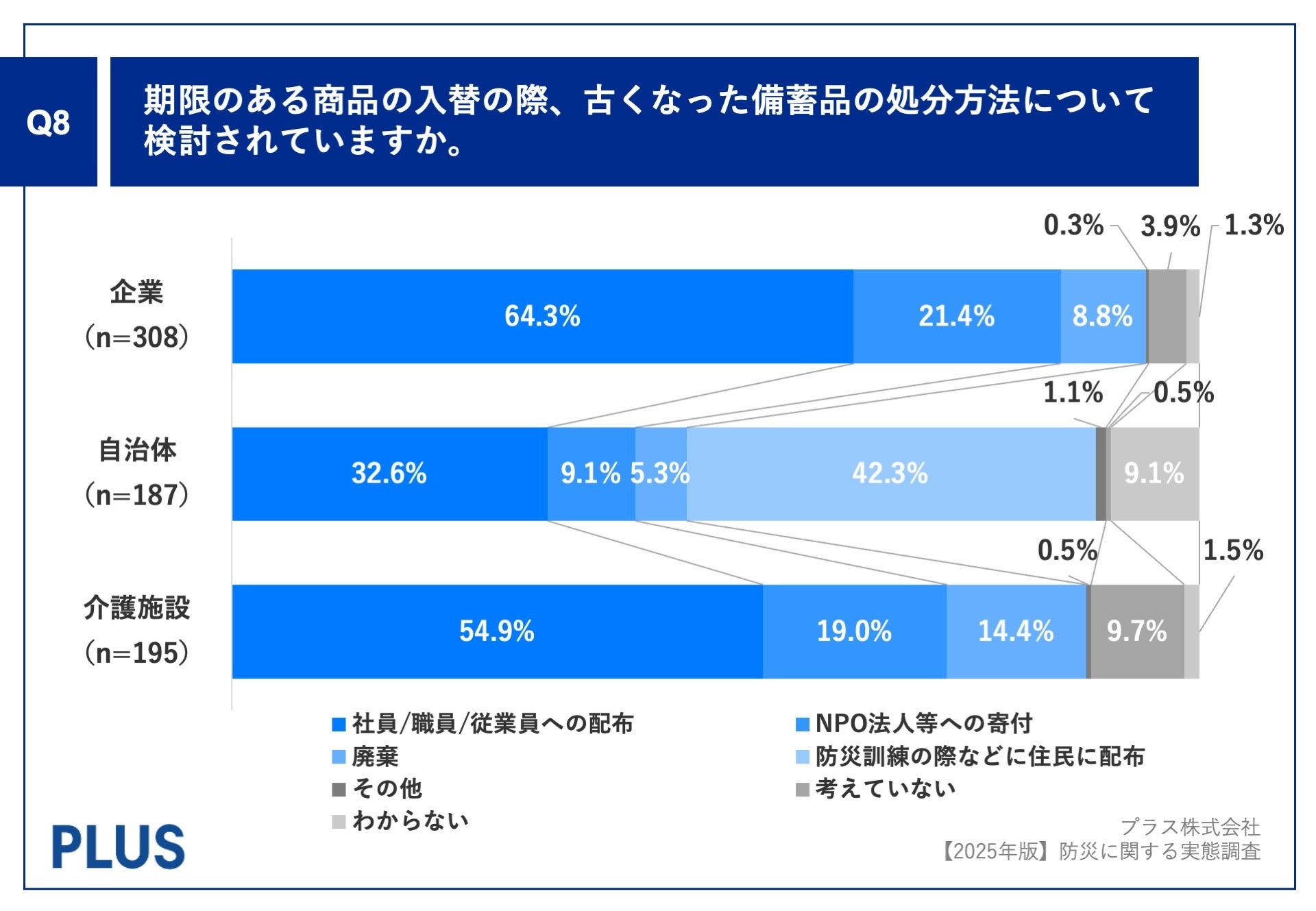 Q3で「防災用品の備蓄」と回答した方に、「Q8.期限のある商品の入替の際、古くなった備蓄品の処分方法について検討されていますか。」と質問したところ、企業(n=308)は「社員への配布」が64.3%、自治体(n=187)は「防災訓練の際などに住民に配布」が42.3%、介護施設(n=195)は「従業員への配布」が54.9%という回答となりました。