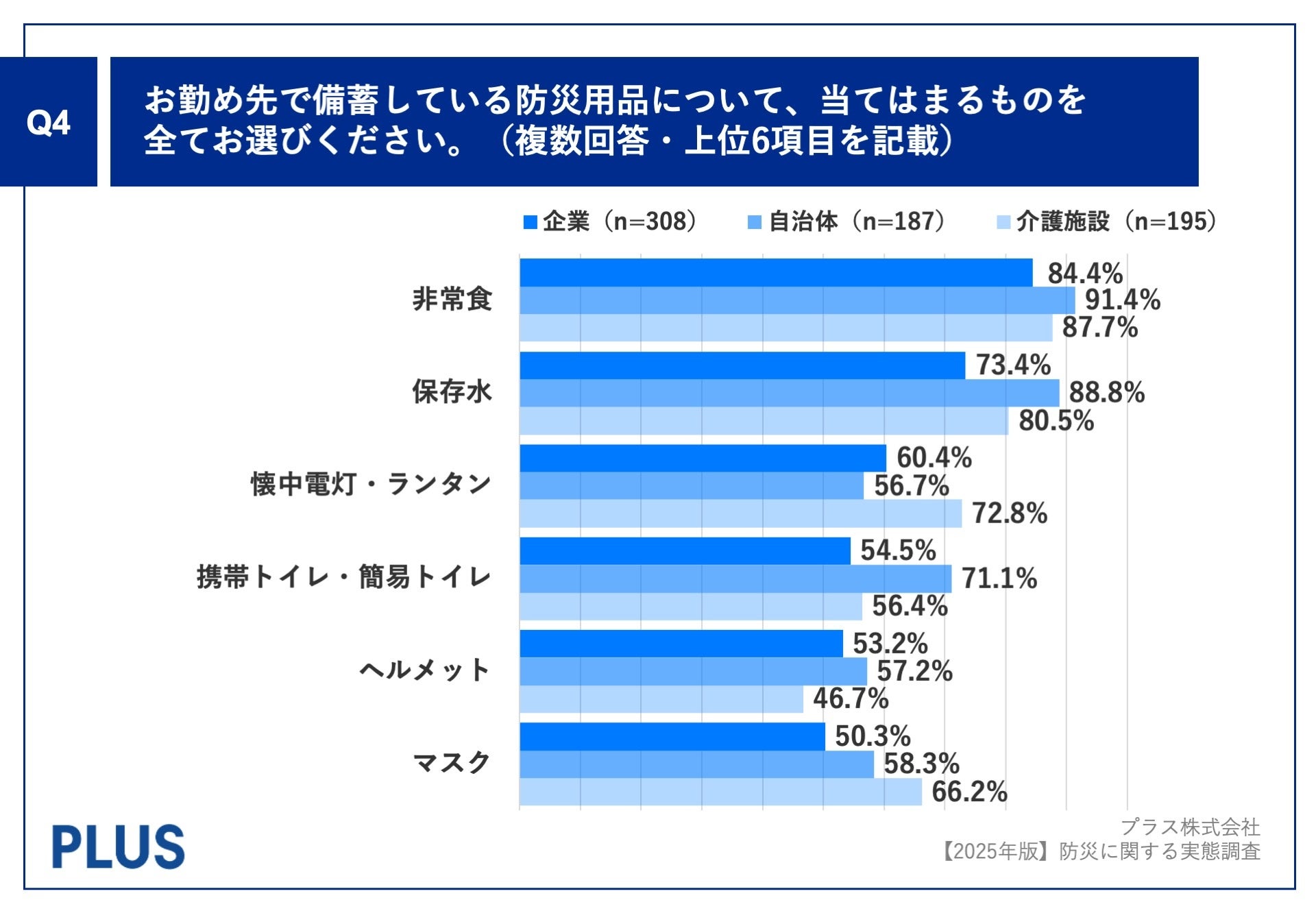 Q3で「防災用品の備蓄」と回答した方に、「Q4.お勤め先で備蓄している防災用品について、当てはまるものを全てお選びください。(複数回答)」と質問したところ、「非常食」が、企業(n=308)84.4%、自治体(n=187)91.4%、介護施設(n=195)87.7%と最多となり、次いで、「保存水」が、企業(n=308)73.4%、自治体(n=187)88.8%、介護施設(n=195)80.5%となりました。