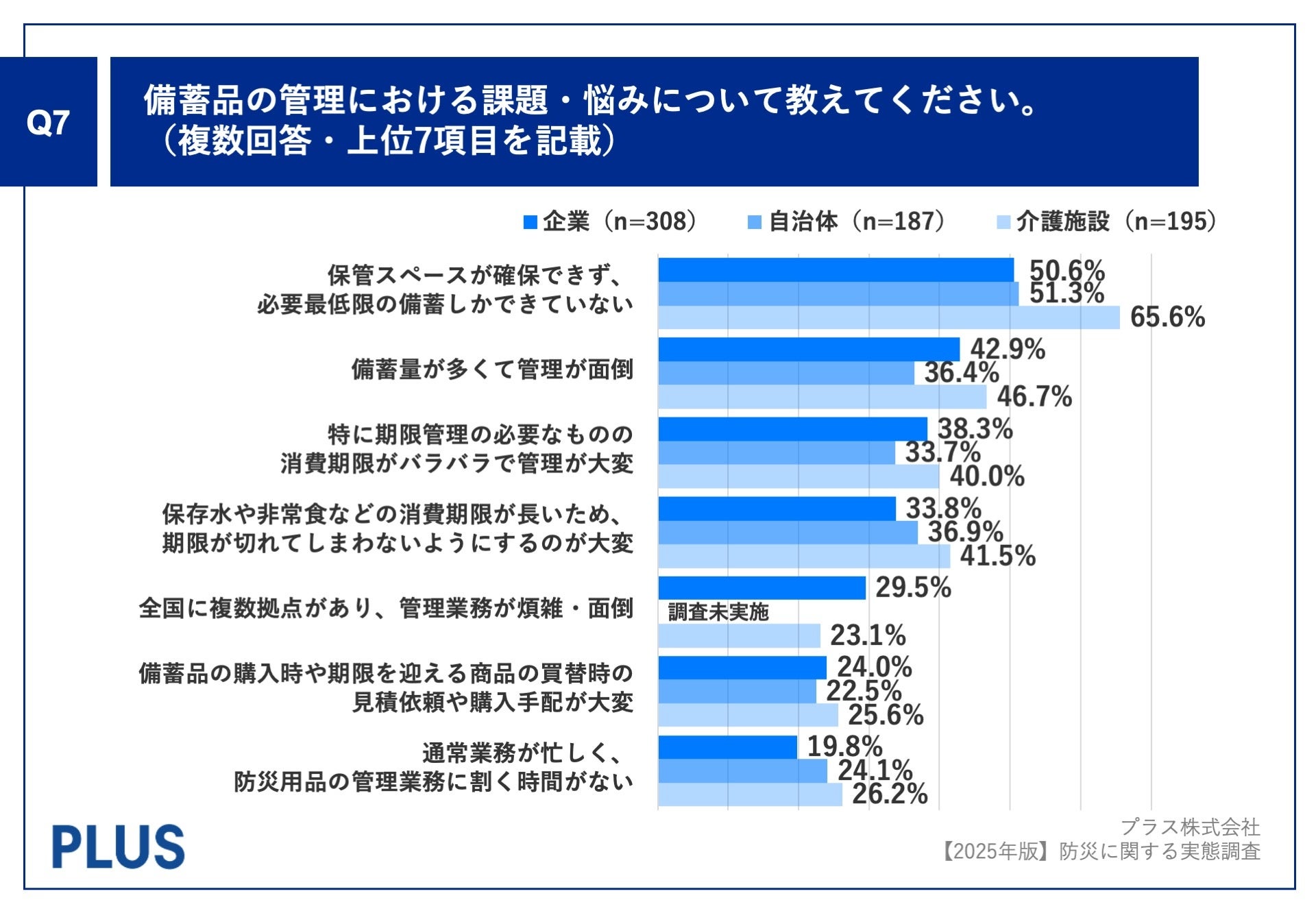 Q3で「防災用品の備蓄」と回答した方に、「Q7.備蓄品の管理における課題・悩みについて教えてください。(複数回答)」と質問したところ、「保管スペースが確保できず、必要最低限の備蓄しかできていない」との回答が、企業(n=308)50.6%、自治体(n=187)51.3%、介護施設(n=195)65.6%と最多となりました。
