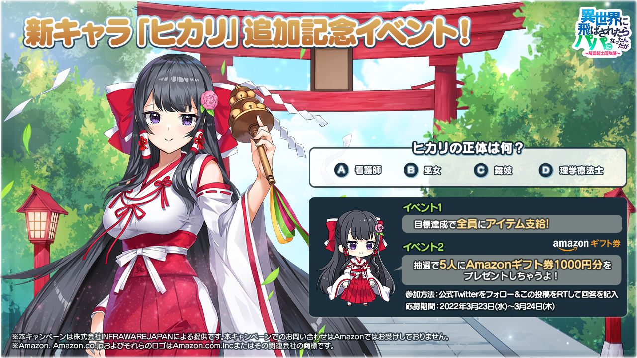 また、今回から新たに公式Twitterでは合計100人に最大5000円のAmazonギフト券が当たるインスタントウィンキャンペーンや新キャラ追加記念クイズイベントなども開催いたします。