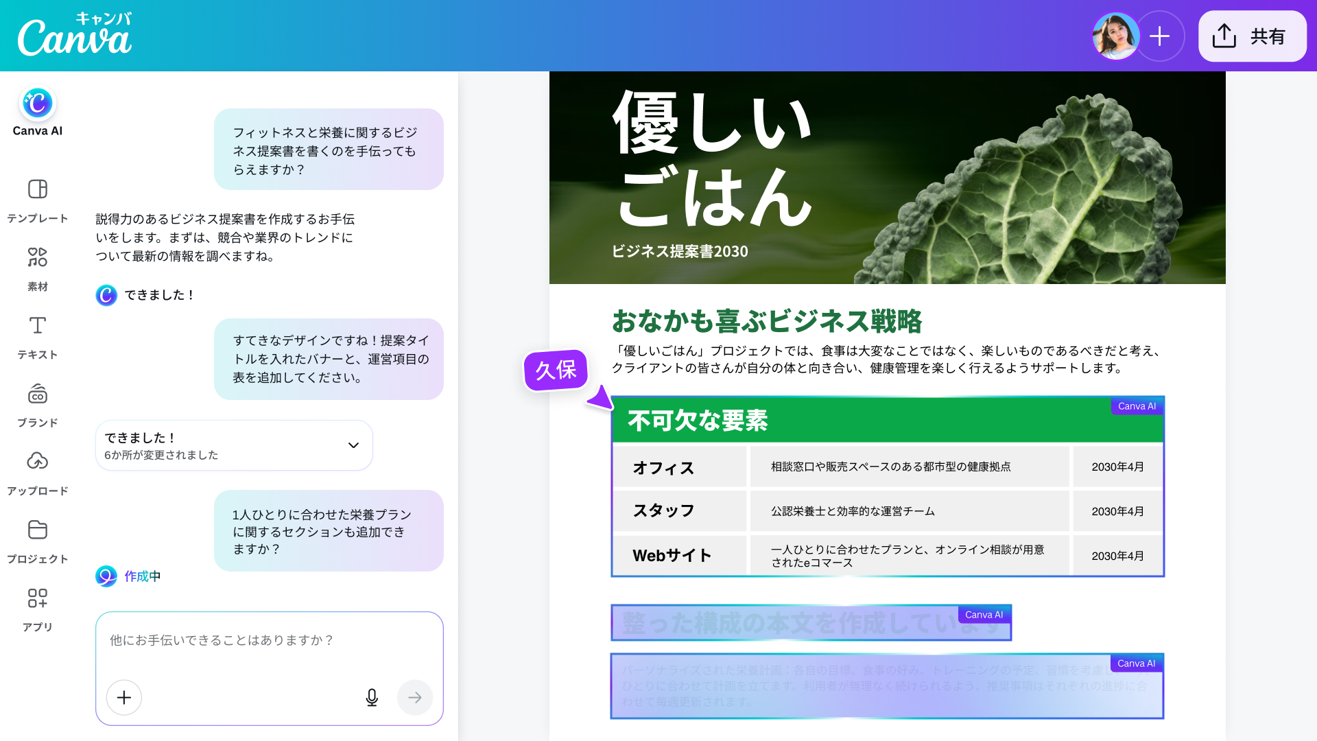 会話型デザインは、自然な対話や音声入力から、アイデアを形にします。白紙のページやテンプレート選びに迷う必要はありません。目的や構成を伝えるだけで、ブランドに沿った編集可能なデザインを即座に生成。単発の出力で終わる従来のAIとは異なり、文脈を維持しながらデザインの調整を重ねることが可能です。