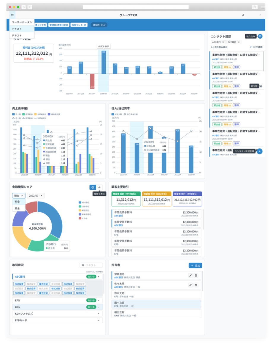 ARIがまず支援したのは、金融機関とそのグループ企業が、顧客情報を共有するための「グループ企業間連携CRMサービス」のダッシュボードづくり。複数の企業の顧客情報を整理して共有できる、シンプルでわかりやすい画面を設計しました。