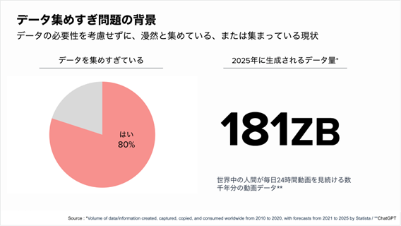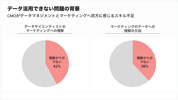 社会が急速にデジタル化する中、消費者はさまざまなデバイスに接触する、あるいは囲まれる中で、ありとあらゆるデータが発生しています。2025年には世界中で生成されるデータ量は181ゼタバイトに上ると推定されています。企業側もマーケティング施策等にこれら情報を活用したいと考えている一方で、80%がデータの利用用途をイメージせず、データを集め過ぎていると回答しています。また、CMOの視点では42%がデータサイエンティストのマーケティングへの理解不足を指摘し、38%がマーケターのデータへの理解不足を指摘しています。データを集めるだけでなく、データを活用する側のスキル向上も喫緊の課題と言えます。