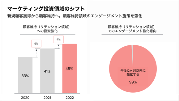 2022年も不安定なマクロ経済情勢を受け、支出に対する消費者の慎重さは依然として続いています。経済の先行きに対する不透明感が増す中、新規の顧客開拓よりも、既存の顧客維持(リテンション領域)に積極投資する傾向が3年連続で高まっています。また、回答者の99%が顧客維持に向けたエンゲージメントを強化すると回答しており、すでに取引のある顧客にフォーカスし、購買行動や嗜好データを活用しながら、マーケティング投資の最大化を意識した活動を強化する企業の姿勢が明らかとなりました。