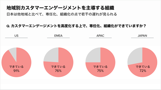 米国をはじめとした先進的な市場では、マーケターは消費者の変わり続けるニーズに対応すべく、カスタマーエンゲージメントを高度化するためのマーケティング基盤の整備を進めつつ、適切な人材を集約、グロースチームとして組織化、専任化する傾向が強まっています。一方、日本ではこの組織化、専任化という意味で、地域と比べ、若干の遅れが見られることが明らかとなりました。必要な人材が様々な部門に散在し、事業毎に異なったシステムでカスタマーエンゲージメントを実践せざるを得ない状況が読み取れます。顧客維持に必要なデータを効率的に集め、適切な人材でマーケティング施策をデータドリブンで展開し続ける環境がビジネス成長に必要不可欠になると考えられます。
