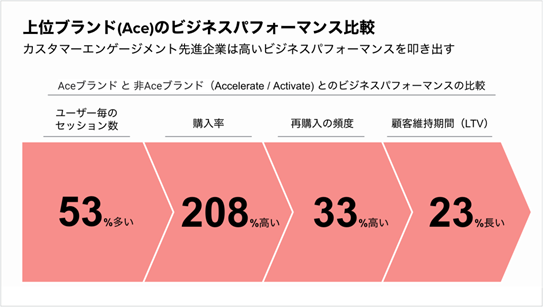 3つの成熟度レベルを詳細に分析すると、成熟度レベルとビジネスパフォーマンスには相関関係がある事がわかりました。Aceブランドは非Aceブランドと比較して、顧客維持期間(LTV)が23%長く、再購入の頻度が33%高く、ユーザーごとのセッション数が53%多く、購入率が208%高いことが調査により明らかになりました。