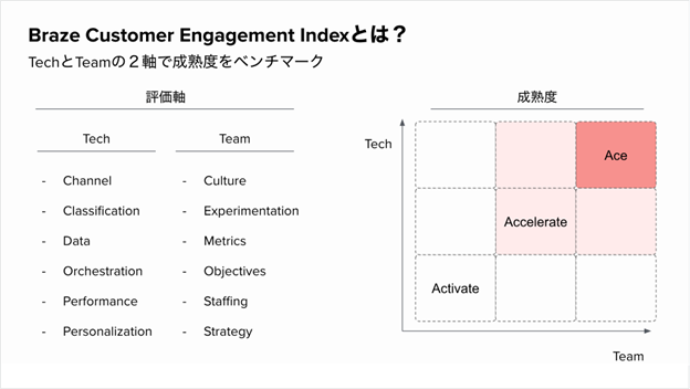 Brazeのカスタマーエンゲージメントインデックスは「テクノロジー」と「チーム(組織)」の2つの重要な軸で構成され、合計12項目で指数化されており、成熟度が高い方からAce(エース)、Accelerate (アクセラレート)、Activate(アクティベート)という、3つの成熟度レベルに分解されています。