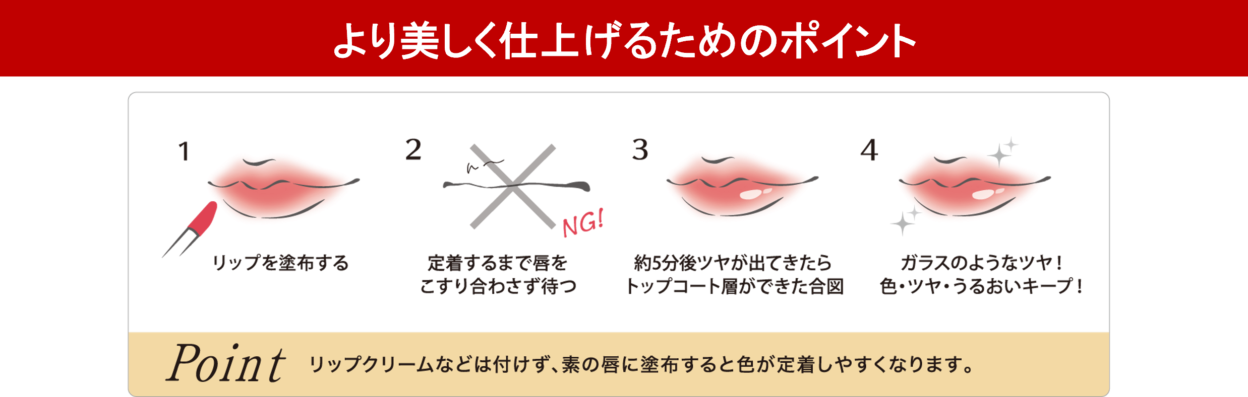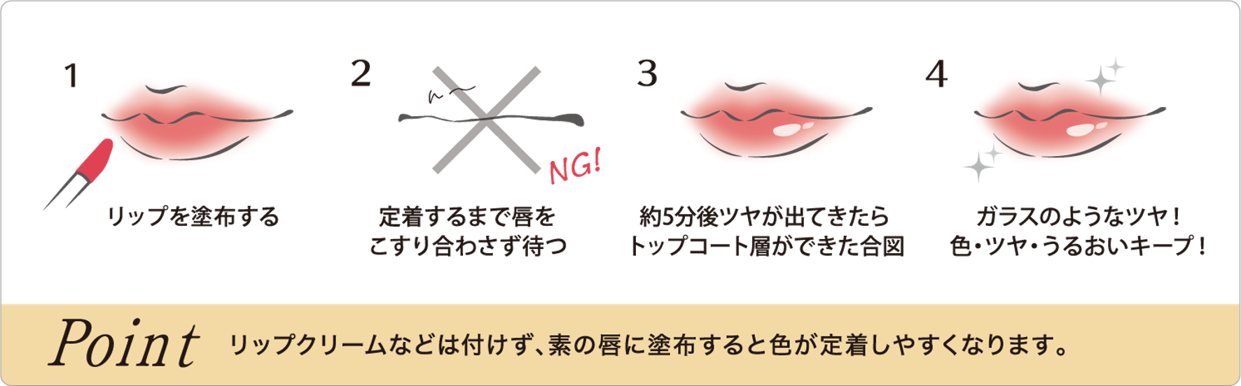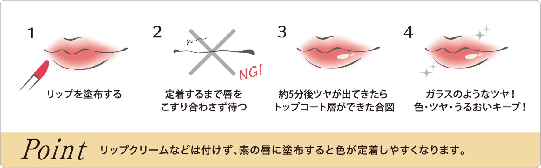 ●適量を唇にのばし、なじませます。塗布後しばらくしてツヤ膜ができるまで※9、唇をこすり合わせず待ちます。ツヤが出てきたらツヤトップコート層ができた合図です。