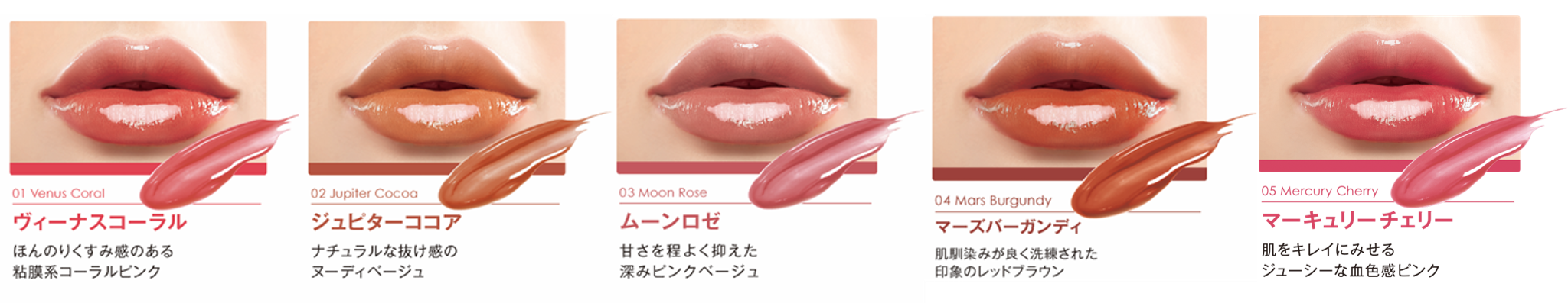 左から01 ヴィーナスコーラル、02 ジュピターココア、03 ムーンロゼ、 04 マーズバーガンディ、05 マーキュリーチェリー