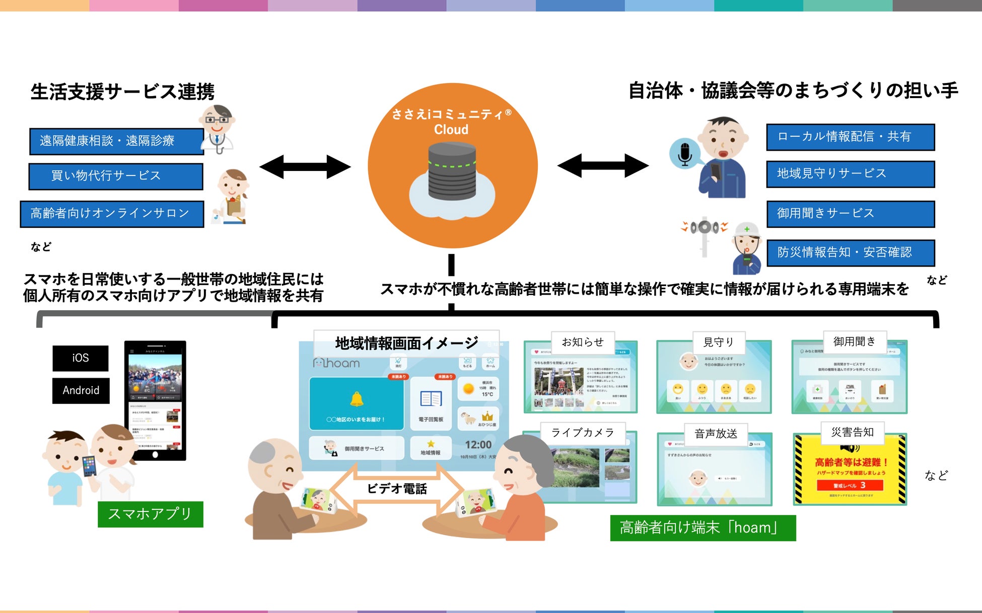 自治体や協議会などのまちづくりの担い手を中心にサービスの運用を行い、サービスの受け手となる住民は高齢者専用端末の「hoam🄬」、スマホアプリのどちらかを使ってこのサービスを享受します。