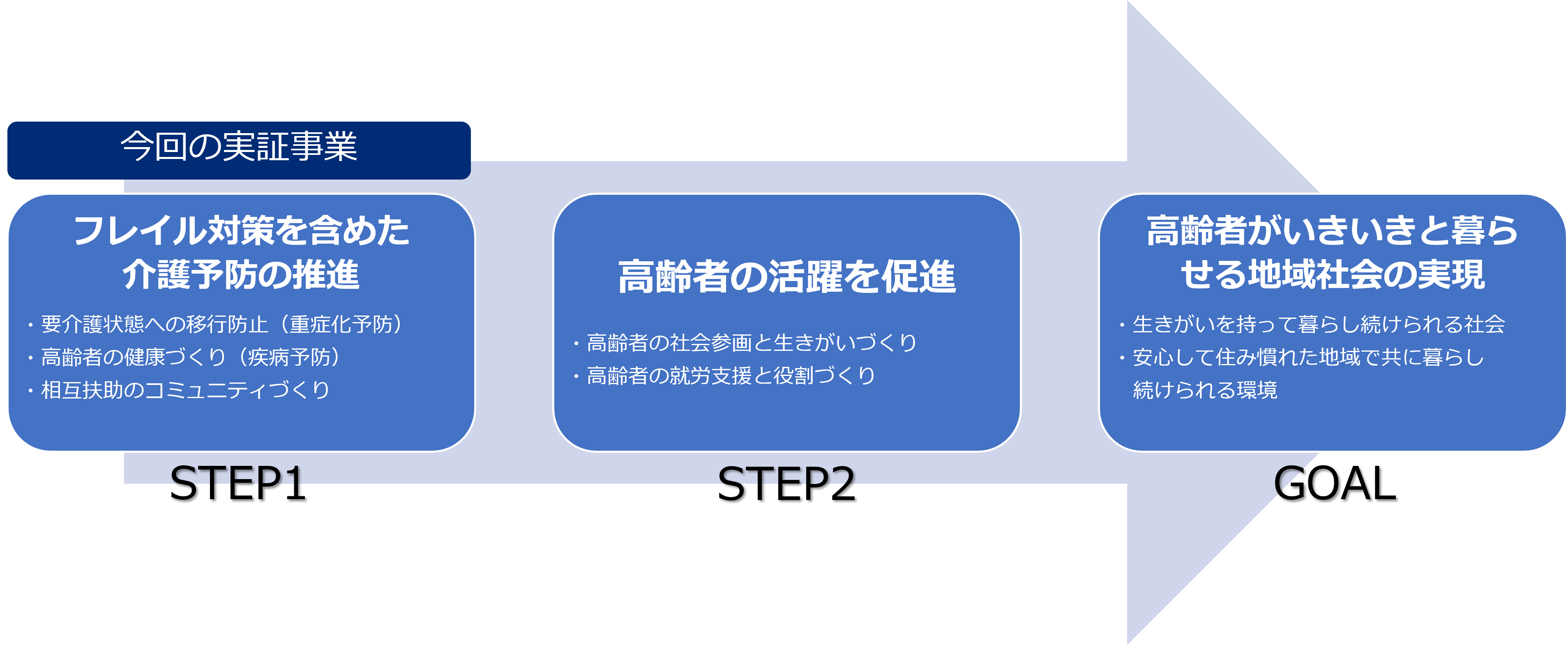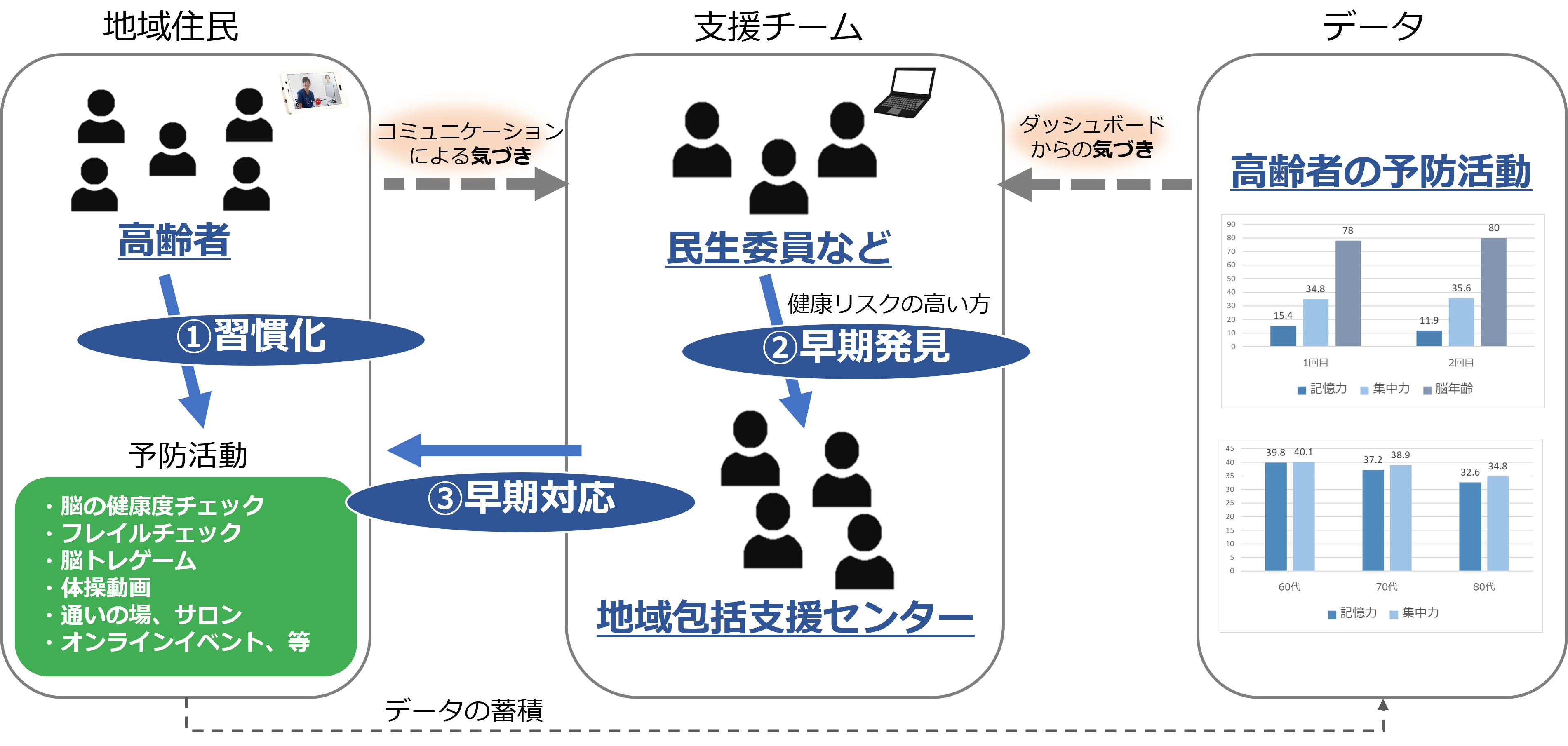 サロンや通いの場などの社会活動や、脳トレゲームや体操、地域の担い手による日々のコミュニケーションなどのデータを活用して疾病予防、重症化予防を行うとともに、いち早く高齢者の心や体調の変化に気づき、地域運営組織をはじめとする関係機関と連携しながら、適切な対応がとれるコミュニティの形成を目指します。