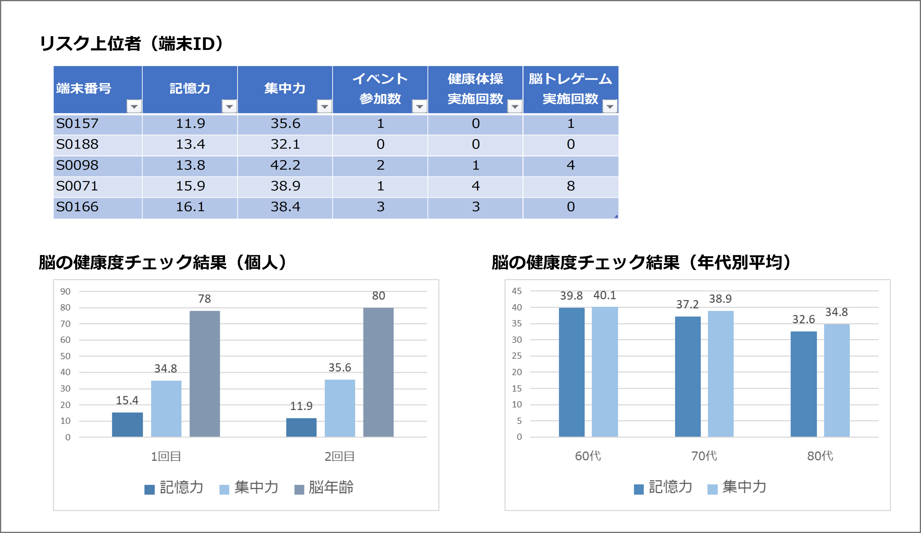 リスクの早期発見、介入のための機能として、日々の地域住民の健康活動への取り組み状況をPCのブラウザでモニタリングします。また脳の健康度やフレイルリスクの高い方をスクリーニングできるダッシュボード機能を備えています。